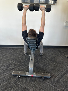 Push the dumbbells upward until arms are fully extended, keeping a slight bend in the elbows at the top.